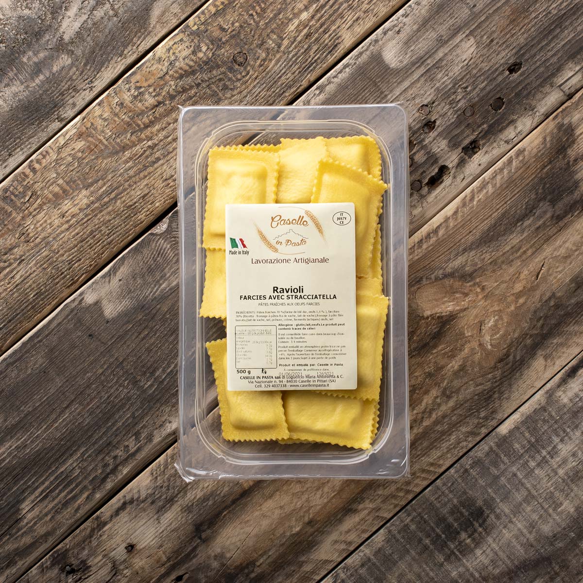 pâtes fraiches : 70% (farine de blé dur, oeufs 1,4%), ricotta lait cru de vache, stracciatella lait cru de vache, sel, poivre